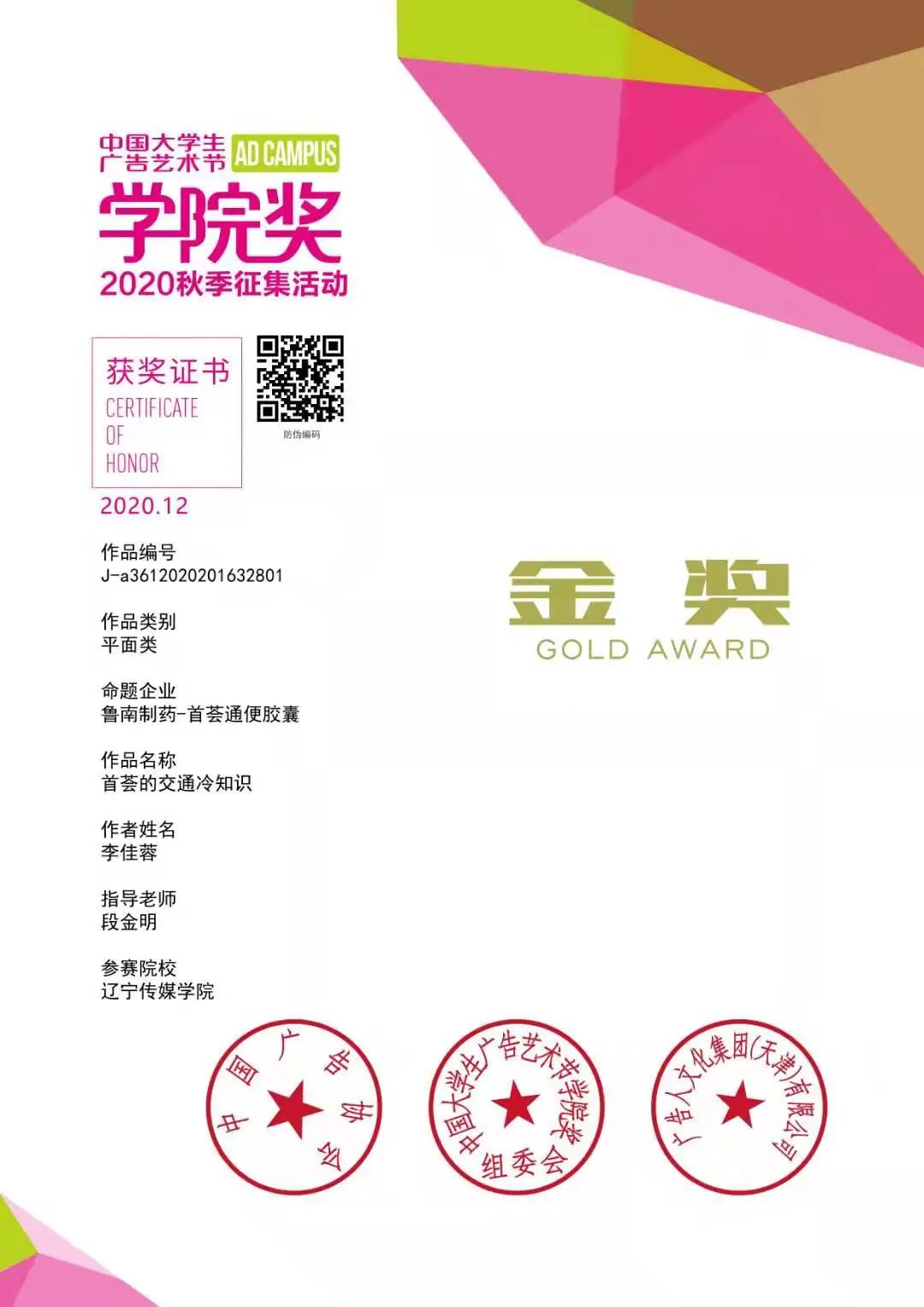 新闻传播学院李佳蓉同学在中国大学生广告艺术节“学院奖”2020秋季大赛中荣获金奖