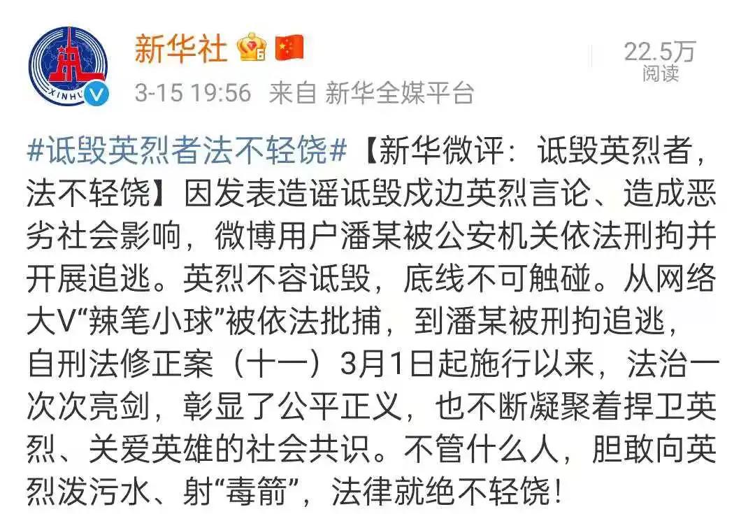02 新华社评潘某在境外诋毁英烈:诋毁英烈者,法不轻饶。
