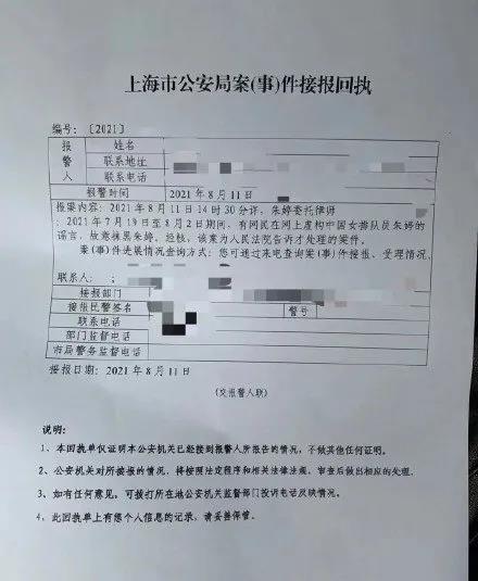 8月11日晚,中国女排队长朱婷在个人社交媒体贴出《上海市公安局案(事)件接报回执》及公证书首页,并配文:“已公证,固定证据。