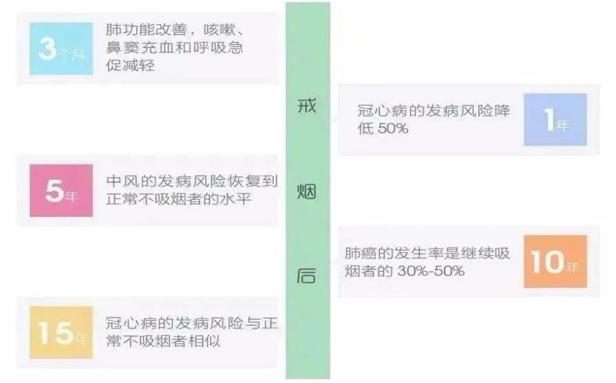 因吸烟所增加的口腔癌、喉癌、食管癌以及膀胱癌等风险降低 50%,中风和宫颈癌的风险降低至平均水平。