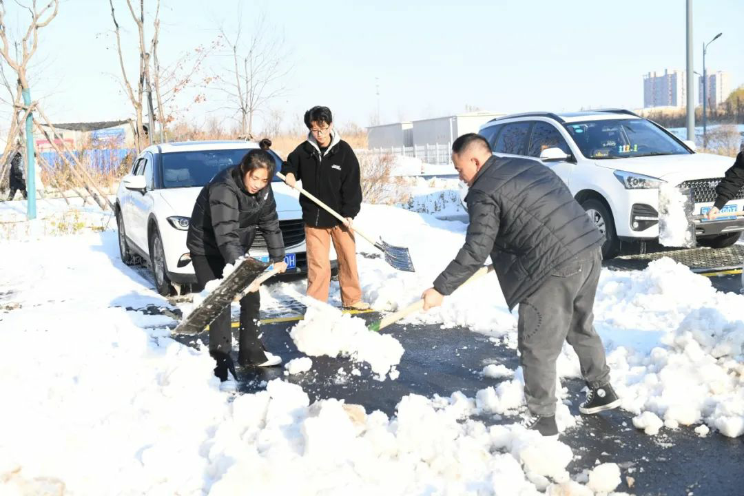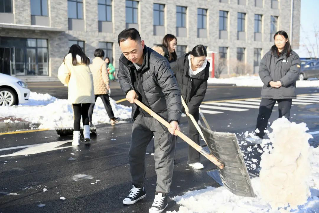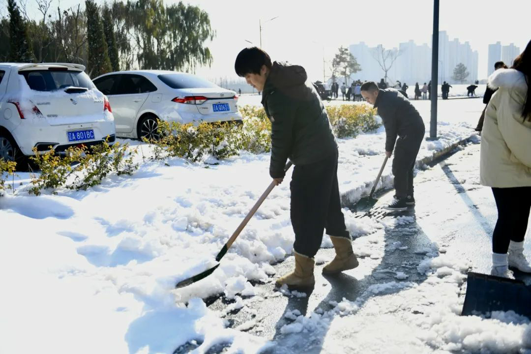 扫雪铲冰工作,分工明确,手持清雪工具,相互配合,全力清除教学楼及周边道路的积雪和暗冰。低温环境使路面结冰让清扫工作变得相对困难,寒风凛冽,但这丝毫不影响师生们的劳动热情,大家团结协作,齐心协力。