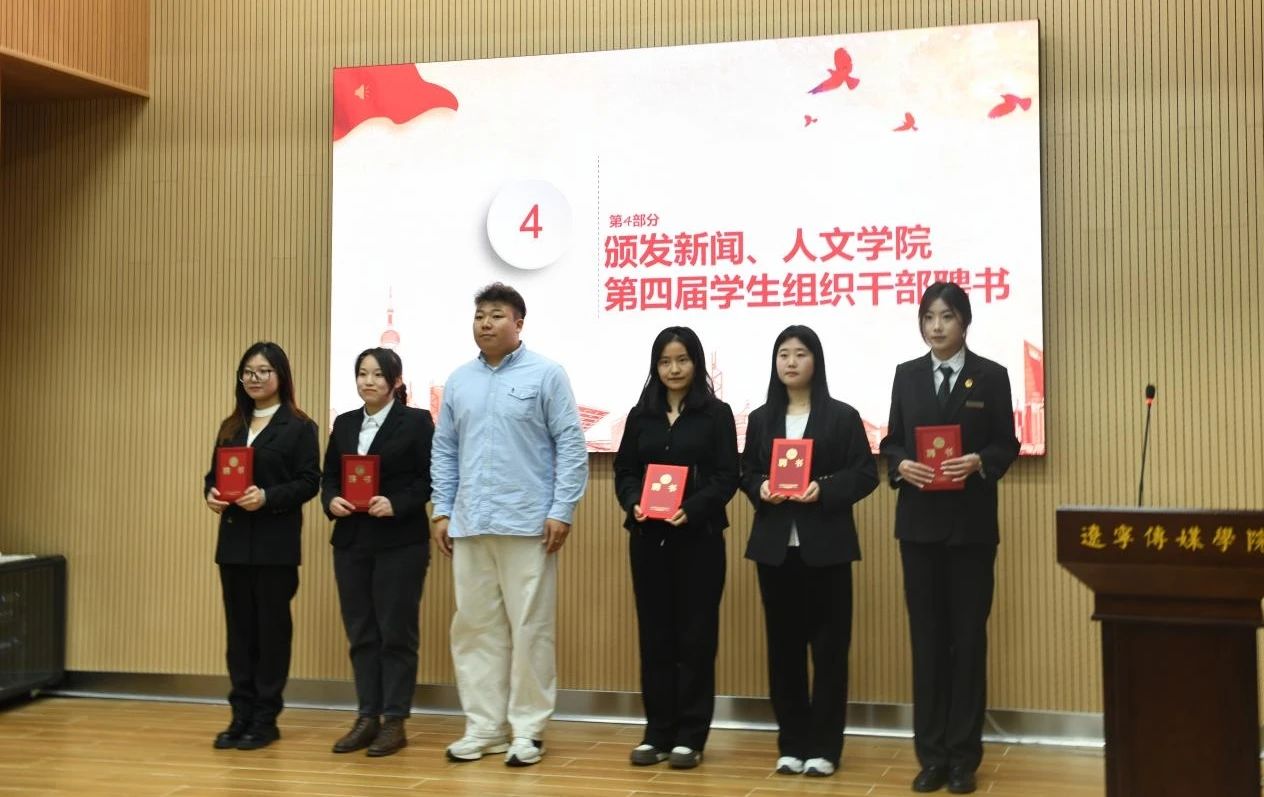城市学院团总支书记李春德为新闻、人文学院第四届组织部和宣传部部长颁发聘书