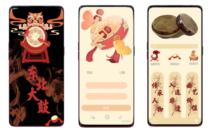 创意说明:设计的非遗东北大鼓主要以黑色、红色、米白色作为主色突出展示其app”传承”、“古典”的韵味,将东北大鼓实物图与动画图相结合,突出其趣味生动的特点,希望通过设计,能够更好的体现东北大鼓的独特魅力。