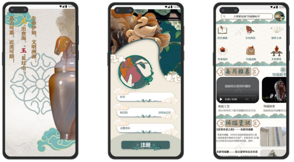 创意说明:本APP是一款传播推广阜新玛雕的软件,本APP将中国风色彩与阜新玛雕相结合阜新玛瑙雕是辽宁省非物质文化遗产之一,通过历史渊源,文化特征,玛瑙选购,文化展馆等方面展示精美阜新玛瑙雕,让更多人了解阜新玛瑙雕,了解玛瑙匠人的工匠精神。