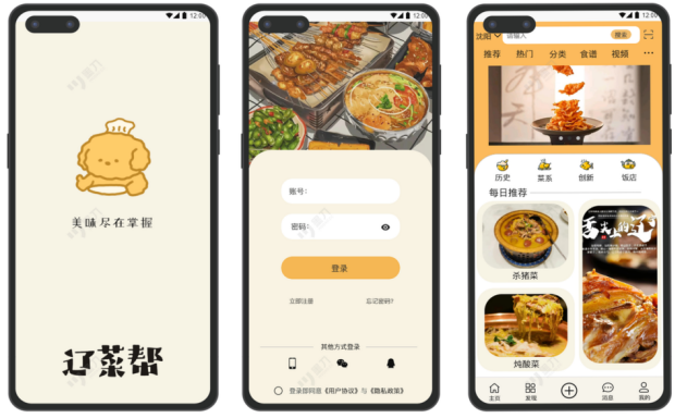 创意说明: 这是一个关于辽菜的APP。辽莱历史源远流长,是根据辽宁内陆地区民族特点饮食习俗,烹饪技巧创建的地方莱系。此APP是一个集辽菜历史,菜系,创新,饭店等应用的多功能APP。主橙黄色调,整体画面给人呈现出愉悦性。