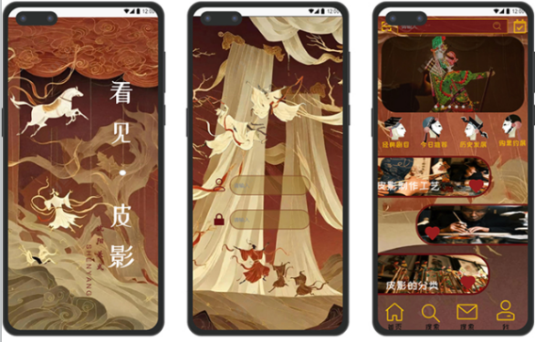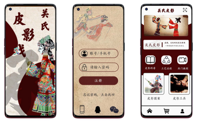 创意说明:本次设计以沈阳关氏皮影作为创意主题,以深红、米白为主色调。将传统皮影与现代APP相融突出趣味和生动的特点,希望通过这一设计,能更好的体现沈阳关氏皮影独特的魅力。
