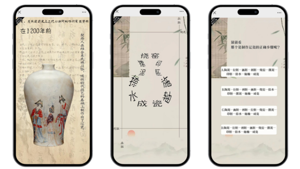 创意说明:本次设计以辽瓷作为创意主题,主色调为复古的黄色、突出展示app“传统”“古典”的韵味,体现出辽瓷的历史悠久和其独特的魅力。并且加入了互动性的元素,突出趣味和生动的特点,希望通过这一设计,能更好的体现辽瓷独特的气质。