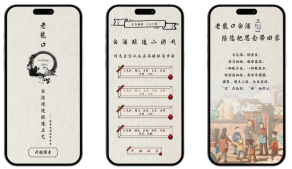创意说明:设计作品以老龙口白酒传统酿造工艺作为创意主题,以米白为主色调,以宣纸为背景,突出展示该app“传统”、“古典”的韵味,将动画和游戏相结合,突出趣味和生动的特点,希望通过这一设计,能更好的体现出老龙口白酒酿造工艺独特的魅力,让大众更加了解我国白酒传统酿造工艺。