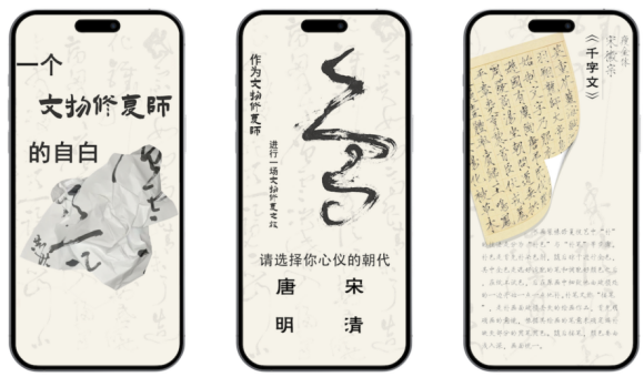 创意说明: 设计以书画装裱修复技艺作为主题,画面风格为简约古风。设计内容以文物修复师的视角展现非遗书画装裱修复技艺的魅力,表达书画装裱修复对于古字文画如病笃延医、枯木逢春的内涵。