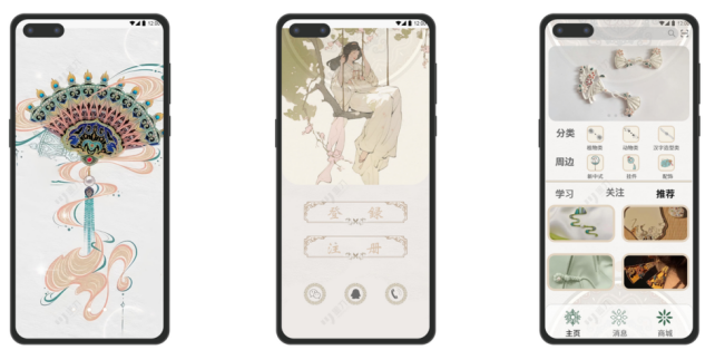 创意说明:盘扣亦称盘纽,是中国传统服饰使用的一种纽扣,用来固定衣襟或起装饰作用。本软件让盘扣以一种新的方式出现在大众视野,摆脱了传统非遗文化的刻板印象,除了用于衣服,还能用于配饰等。该画面主要采用裸色系,恬静自然,舒心惬意,能够更加平静的体验盘扣文化。如今盘扣更是演变为富有装饰性的工艺美术品,开始作为一种中国的标志性元素,出现在国际时尚圈。作为中华民族智慧与文明的结晶,非物质文化遗产是宝贵的精神财富,必须传承好保护好,这也为本app设计的本质和初心