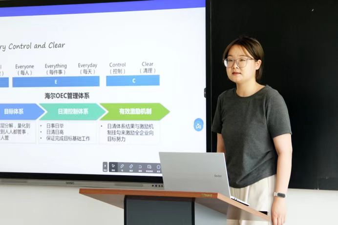 来自广告与广播电视系的尹瑞佳老师在《数字出版管理》课上,讲到了海尔的OEC管理法:日事日毕,日清日高。企业要把精细的管理、优质的产品和服务、杰出的品牌影响力作为企业发展的核心拉动力,就需要企业文化、价值观和明确的目标作为牵引,以OEC日清控制作为稳固的支撑力,克服企业内部员工惰性的阻力和竞争对手带来的阻力,让海尔这样优秀的中国企业管理法早日走向世界。