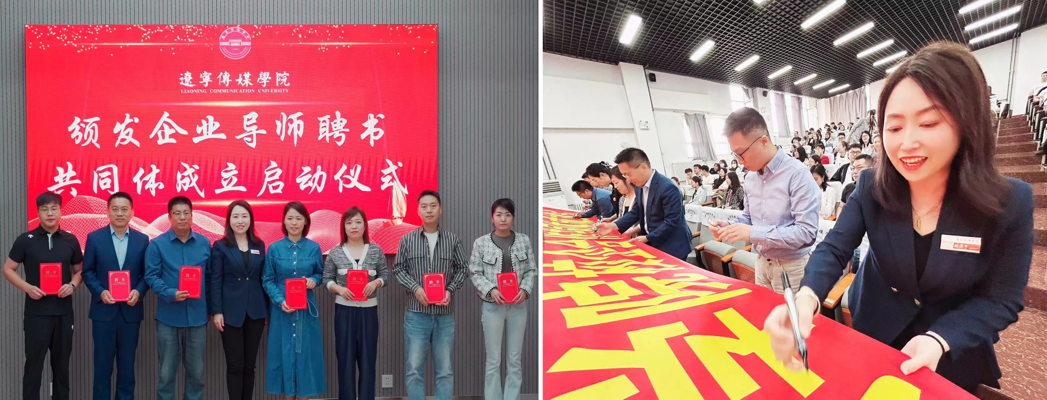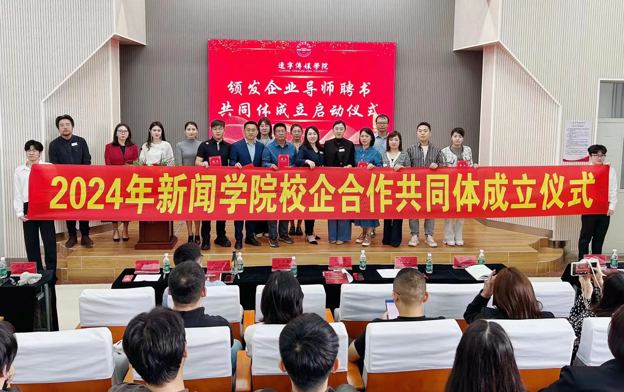 由新闻学院副院长张潇予为与会企业代表颁发“企业导师”荣誉聘书。伴随着隆重的音乐,与会双方共启“2024年新闻学院校企合作共同体成立仪式”,共同在“2024年新闻学院校企合作共同体成立仪式”条幅上签字并合影。
