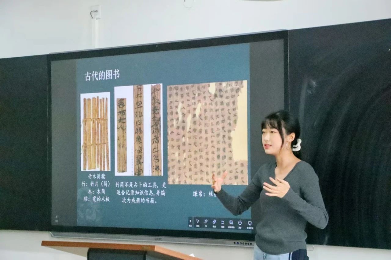 随后出场的李清越老师年轻果敢、出手不凡。她讲授《图书学》课程中“古代图书形制发展”相关内容。她从伏羲八卦、河图洛书讲起,讲到甲骨卜辞,又提及竹简缣帛等知识,将古代书籍发展史娓娓道来,不疾不徐,很有自信。尤为可贵的是,能够不露声色地穿插思政育人并不失时机地开展互动练习,足见其在课程节奏把控上的游刃有余。