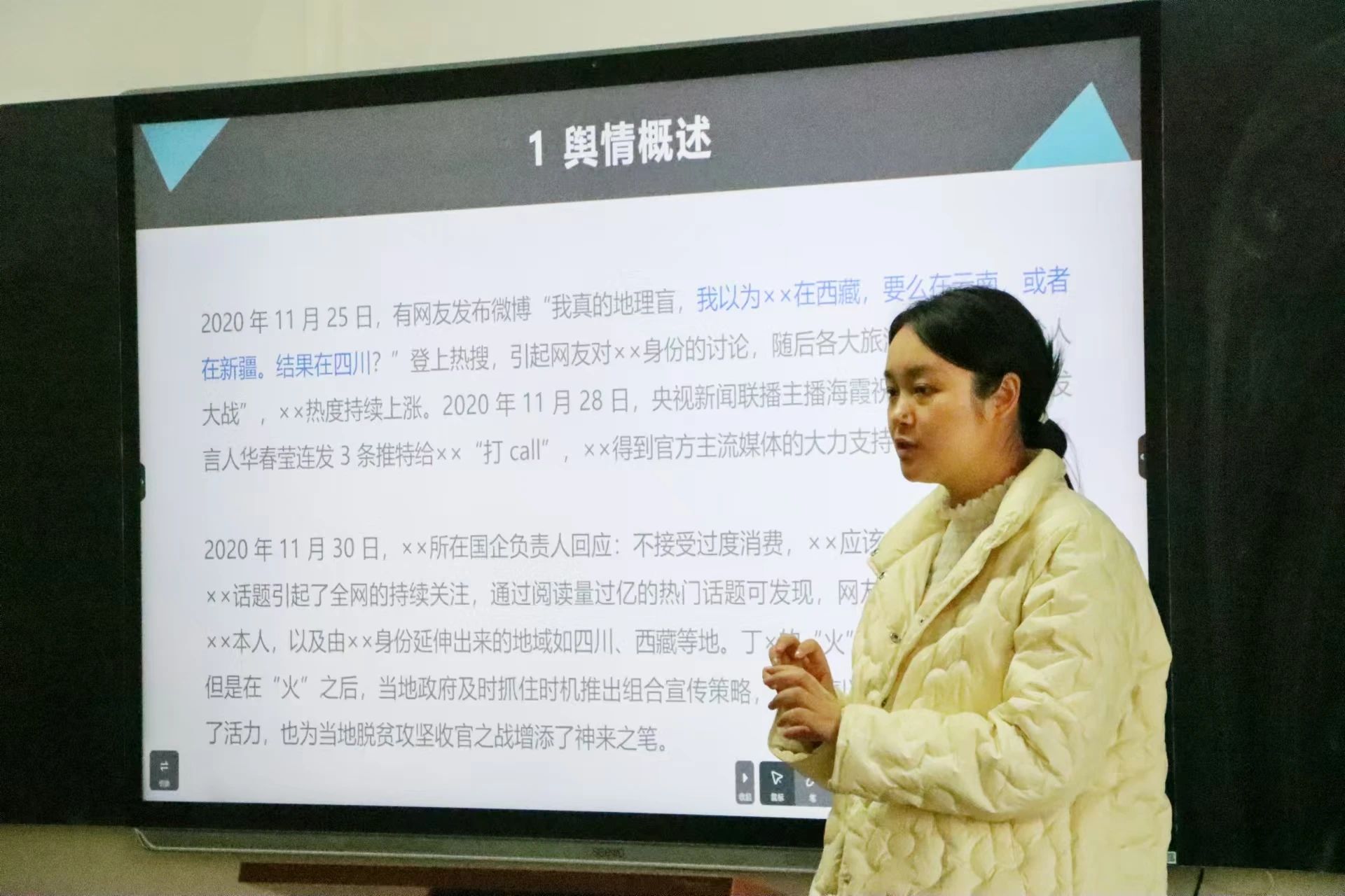 舒倩老师带来《网络舆情监测与研判》课程的其中一节。她从视频案例入手,解剖麻雀,小中见大,令人印象深刻;她利用精彩的视频开路抓人眼球,然后阐述理论分析案例,总结经验提出建议等,课程设计科学合理、逻辑周密、系统完整,她的讲授看似波澜不惊,分析时事却能鞭辟入里;案例分析朴实无华,理论阐述简练透彻,低调内敛的教学风格中隐隐透出幽默松弛的感觉,令人闻之亲切。