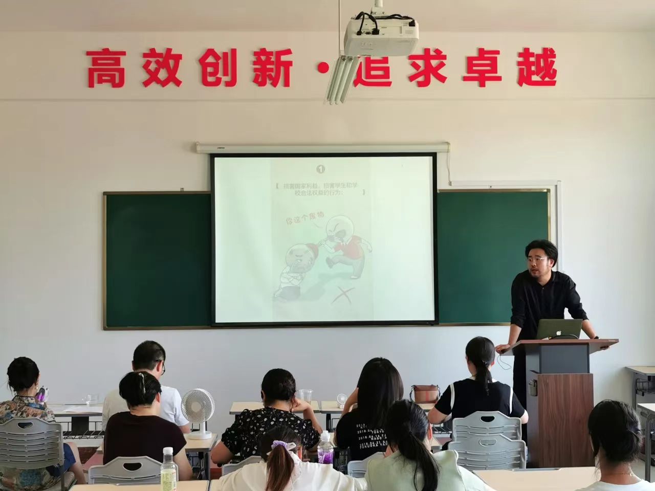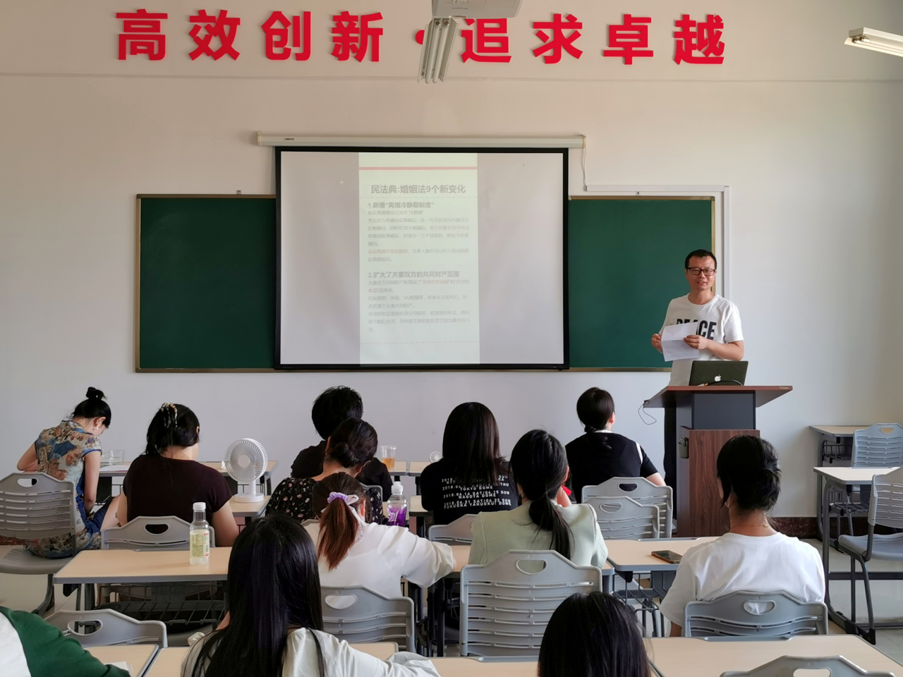出版系主任毛思泽以《民法典:婚姻法9个新变化》为切入展开对民法典的学习分享,一度引发了全场热烈的互动。他用不失风趣的语言告诫:国家法律是公民婚姻生活的保障,有法可依为基础,家庭生活越安定,老师们越能更好地投身工作。希望所有老师知法守法普法,尊重婚姻、幸福生活、积极工作。