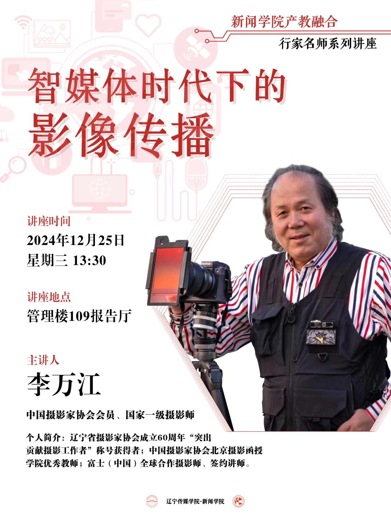 在媒体技术日新月异的当下,媒体人作为内容的创作者与传播者,深入探索智媒体相关知识并掌握影像传播策略显得尤为重要。为了让广大师生更全面地了解智媒体行业,把握传媒产业最新的人才需求趋势,以及学习并掌握智媒体下影像传播的知识。新闻学院悉心筹备,诚挚邀请到了中国摄影家协会会员、国家一级摄影师李万江先生来到beat365,开展一场以《智媒体时代下的影像传播》为主题的精彩讲座。