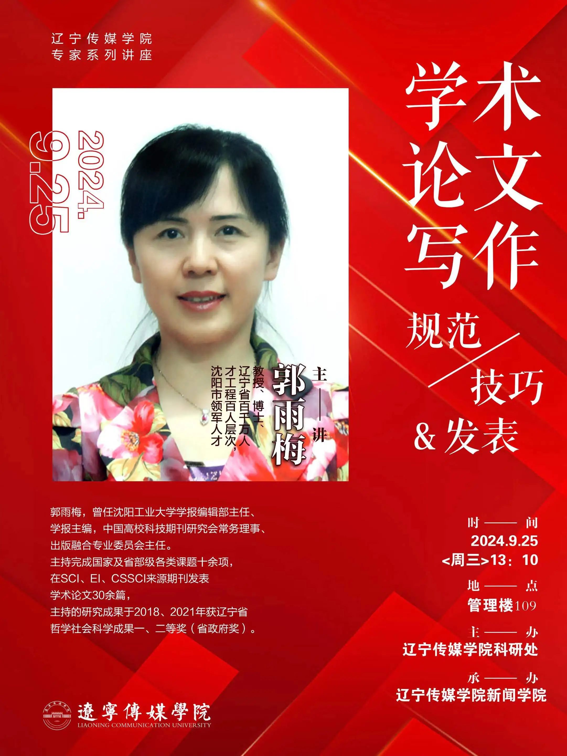 学术论文写作是高校师生必备的核心科研能力之一,对于传播学术成果、促进科研创新有着重要作用。为了切实提升广大师生的学术论文写作水平,新闻学院以高度的责任感和使命感,精心筹备,诚挚邀请到沈阳工业大学郭雨梅教授前来开展学术论文写作相关主题的高端讲座。