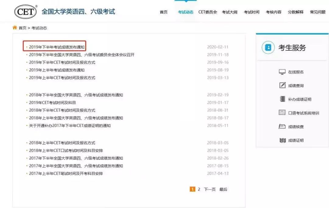 发布内容:2019年下半年全国大学英语四、六级考试(含口语)成绩。