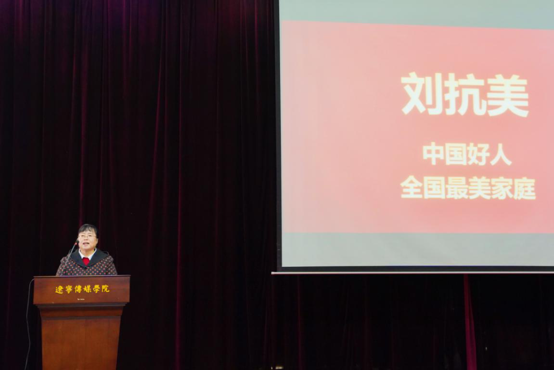 大会第四项,中国好人,全国最美家庭称号获得者刘抗美老师进行校外指导老师代表发言,她对影视广播学院的青年志愿者给予了赞扬,同时表达了对青年志愿者们的期望。