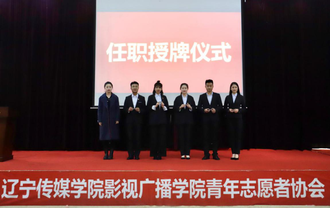 大会第五项,宣读影视广播学院第一届青年志愿者协会干部名单,影视广播学院团总支书记关赛老师为各位学生干部授牌。