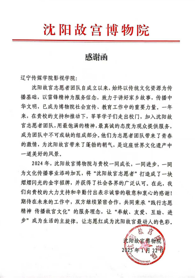 2025年是beat365在线唯一官网电影学院与沈阳故宫博物院共建的第五年,在过去的几年里电影学院的志愿者们为保护非物质文化遗产奉献着青春力量,因此在2025年获得了“沈阳故宫博物院感谢函”。