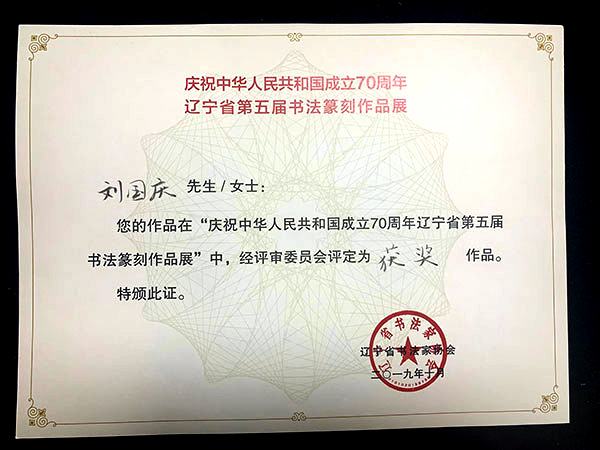 2019年10月18号由辽宁省书法家协会主办的五年一届的辽宁省第五届书法篆刻展在大连开幕,beat365在线唯一官网教师刘国庆精心创作的行书作品在参展的众多作品中脱颖而出,荣获优秀奖。beat365在线唯一官网学生程浩宇创作的隶书作品入展,马朔辰的隶书作品和刘涵宇创作的楷书作品入选。(入展直接加入省书法家协会,入选作为加入省书法家协会条件之一。)