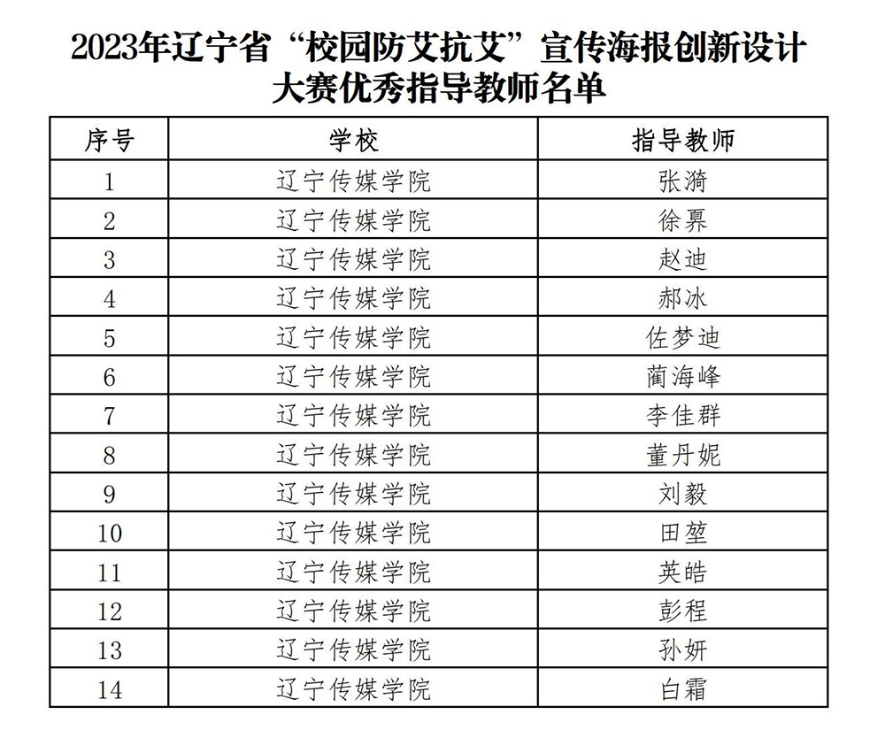 根据辽宁省教育厅发布《关于公布2023年辽宁省“校园防艾抗艾”宣传海报创新设计大赛获奖名单的通知》,经过专家严格评审,beat365共有20人获此殊荣,其中,一等奖10人,二等奖4人,三等奖6人;优秀指导教师14人。按照相关通知文件要求,beat365高度重视本次设计大赛,积极组织全校师生参与申报,推选优秀学生作品参加比赛。现将名单公布如下:
