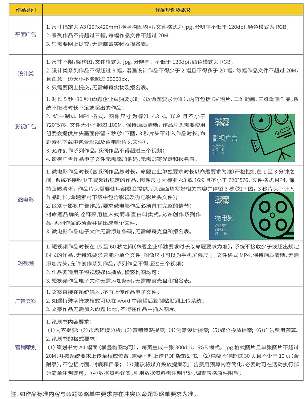 参赛作品按照组委会指定广告主提供的命题策略单进行创作。命题策略单及命题企业素材文件详见学院奖官方网站:xj.5idea.com 了解详细信息请登录官方网站或关注新浪微博@学院奖
