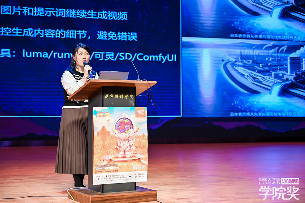 本次活动还邀请到科大讯飞品牌市场中心品牌经理赵玺君女士为大家带来专题讲座。赵老师拥有丰富的教学与实践经验,致力于人工智能领域的品牌建设,对AIGC赋能品牌、营销、传播、广告的实战应用和AIGC前沿创意呈现形式有深入研究,拥有多项从0到1创建品牌的项目案例。通过赵老师的精彩演讲将现场气氛推向高潮,与会师生均获益匪浅。