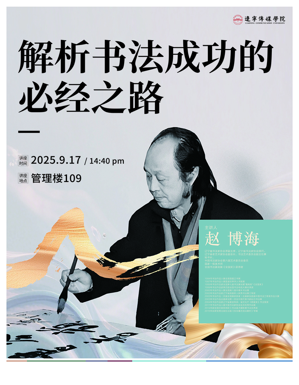 为深化中华优秀传统文化浸润,丰富校园艺术文化生活,9月17日下午,“解析书法成功的必经之路”主题讲座在管理楼109教室顺利开展。本次活动由书法系主任海玉豪主持,特邀国家一级美术师、辽宁省书法家协会顾问、原副主席赵博海先生担任主讲人,书法学专业、汉语言文学专业、绘画专业等近二百名学生参加讲座,现场座无虚席,反响热烈。